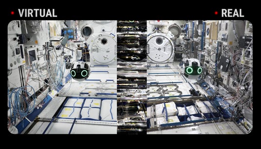 こちらの動画は、ISS内の実機とデジタルツイン上で同様の動作をした際の比較動画です。左側が現実の「きぼう」内でのロボットの挙動を録画したもの、右側がデジタルツインです。