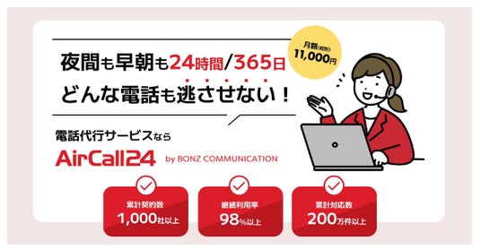 株式会社ボンズコミュニケーション(本社:神奈川県横浜市、代表取締役社長:山本 篤史)は、自社が提供する24時間365日の電話代行サービス「AirCall24」のキャンペーンを開始しました。