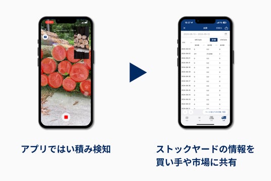 はい積みにiPhone/iPadをかざすだけで径級の測定・材積の算出を行えます。