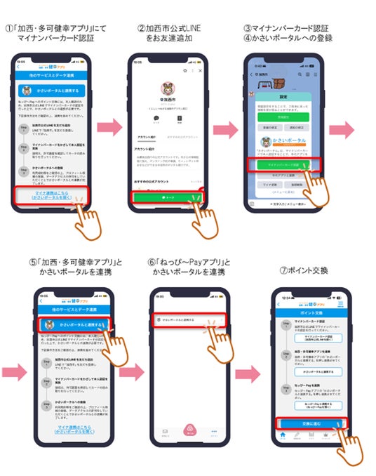 加西市では、デジタル地域通貨とポイントにより、市民の利便性と満足度を向上させるとともに、地域経済と団体活動を活性化することを目指しています。2024年6月1日より、加西市内で利用されている各アプリから地域通貨へのポイント交換機能をリリースする運びとなりました。これにより、「加西・多可健幸アプリ」や各アプリで貯めたポイントを、「ねっぴ~Pay」ポイントへ自由に交換できるようになります。ポイント交換には、加西市公式LINEを通じたマイナンバーカードの認証および、加西市データ連携基盤「かさいポータル」との連携が必要です。