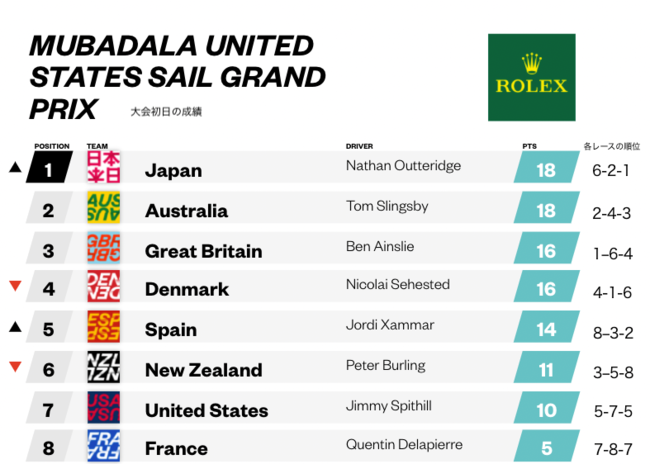 その他、フランスは7、8、7位の成績で、アメリカに5点差で最下位。ニュージーランドは、第3レースで最下位となるなど厳しい戦いでしたが、最終的にスピットヒルに1ポイント差をつけ6位で初日を終えています。