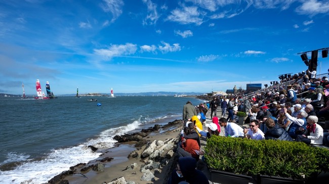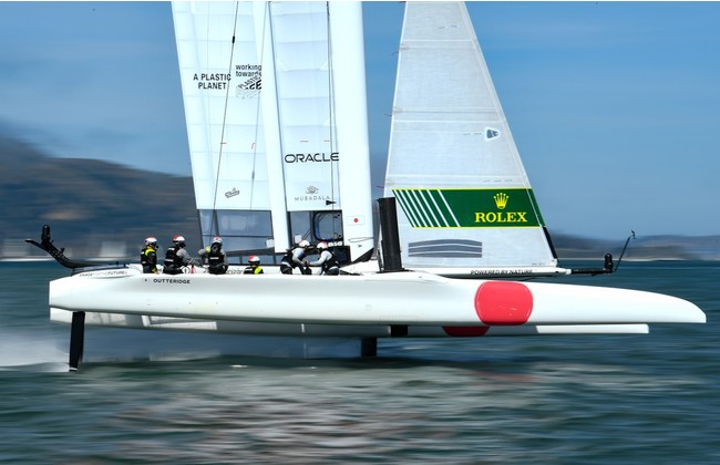 春の陽気ただようサンフランシスコに集まった大観衆を前に、日本とオーストラリアが素晴らしいパフォーマンスを見せ18ポイントの同点でフリートをリード。最後のレースで1位をとった日本が暫定首位で初日を終えました。オーストラリアはトップフィニッシュこそ逃したものの、安定したパフォーマンスで、日曜日のグランドファイナルに向け、上々の仕上がりを見せました。