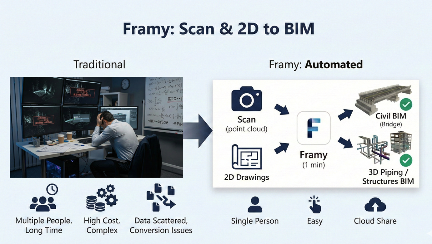 2次元図面や点群データから、BIM/CIMモデルを自動生成する技術です。特に、非構造化データである点群を、部材単位で意味のあるBIMモデルへ瞬時に変換する技術が、建設プロセスのデジタル化を加速させる鍵として評価されました。