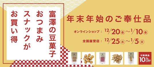 日本最大級の製菓・製パン材料、器具専門店として創業105年を迎える株式会社富澤商店は、年末年始限定で「年末年始ご奉仕品セール」をオンラインショップと全国の直営店にて開催いたします。オンラインショップでは2024年12月20日(金)~2025年1月10日(金)まで、店舗では2024年12月25日(水)~2025年1月5日(日)までの期間中、富澤商店の定番・人気商品である豆菓子やスナック菓子など全85点が10%割引でお得にご購入いただけます。