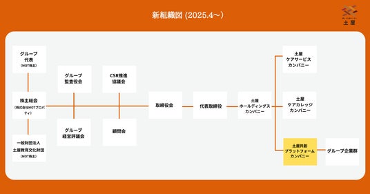 介護のトータルケアカンパニーとして全国47都道府県で障害をお持ちの方や高齢者に対して介護サービスを展開する株式会社土屋(本社:岡山県井原市、代表取締役:高浜敏之、以下「土屋」)は、2025年4月より、グループ全体の連携強化とグループ内での協業や人材の流動性を高める「土屋共創プラットフォームカンパニー」を設立いたしましたのでお知らせいたします。