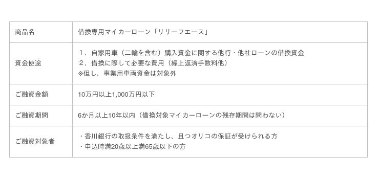 株式会社オリエントコーポレーション(東京都千代田区、代表取締役社長:飯盛徹夫、以下「オリコ」)は、株式会社香川銀行(香川県高松市、取締役頭取:山田径男、以下「香川銀行」)と提携し、2022年4月1日より、借換専用マイカーローンの取り扱いを開始いたします。