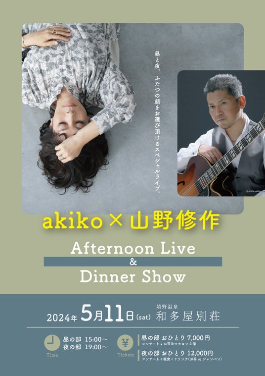 名門ジャズレーベル「ヴァーヴ」初の日本人女性シンガーとしてユニバーサルミュージックよりデビュー、日本を代表するジャズシンガー「akiko」と、ジャズギター専門誌で日本のジャズギタリスト100人に選ばれるなど、世界で高く評価される山野修作。2024年5月11日(土)に佐賀県嬉野温泉・和多屋別荘にて、おふたりのスペシャルライブを開催します。