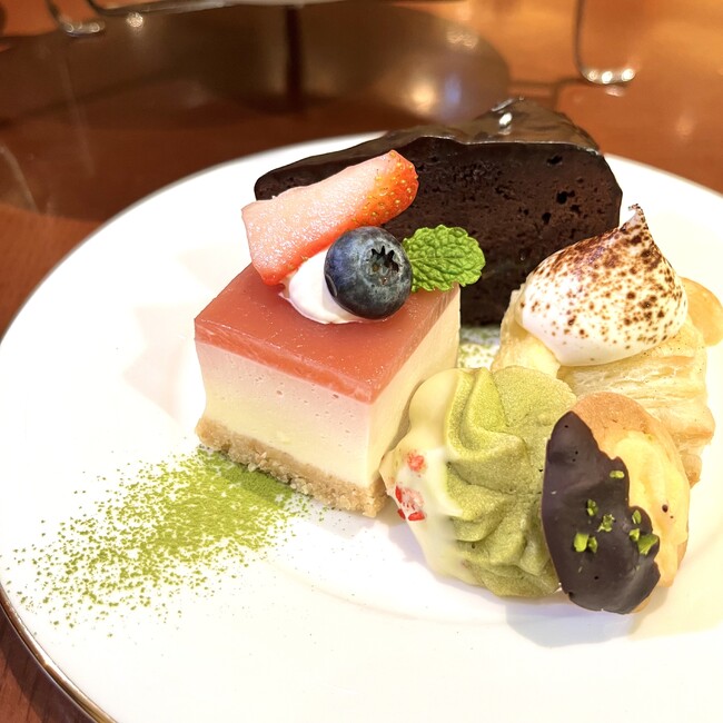 上段には、濃厚なチョコレートにマーマレードジャムの酸味がアクセントになっているザッハトルテ風ケーキと、甘いイチゴの風味と濃厚でありながらさっぱりとしているレアチーズケーキ、香ばしいパイ生地に自家製のレモンカスタードクリームとふわふわのメレンゲをのせたレモンパイ、さっくり軽い優しい甘さのクッキーは自家焙煎の珈琲と相性抜群のスイーツに仕上げました。