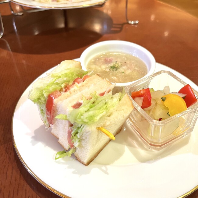 中段には、当店自慢の最高級生食パンにブラックペッパーのきいたクリームチーズを塗りシャキシャキレタスと厚切りトマトを挟んだサンドウィッチと、彩り鮮やかな5種類の野菜を和えて、見栄えも味わいも抜群のイタリアンマリネ、香ばしいベーコンにとろけるじゃがいもが後をひく美味しさの旨みたっぷりベーコンポテトポタージュになっております。