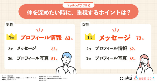 特に、男性は「プロフィール情報」、女性は「メッセージ」を重視する傾向