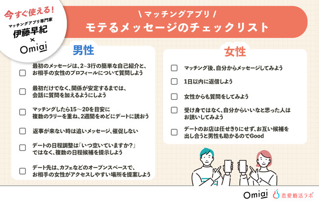 一方、利用者が増える中、出会いを成就させるためにはアプリの特性を踏まえたアプローチが大切です。今回は、お相手との距離を縮める手段の一つである「メッセージ」に着目し、マッチングアプリ専門家・伊藤さん監修のもと、「モテるメッセージチェックリスト」を公開しました。引き続き、より多くの皆様の将来を見据えた出会いの成就に繋がることを「Omiai」一同応援しております。