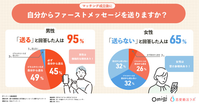 「マッチング成立後のファーストメッセージ」について、男性は「自分から送る(必ず自分から送る/どちらかといえば自分から送る)」が95%と非常に多くの方が自分から送っているのに対し、女性は「送らない(自分から送らない/どちらかといえば自分から送らない)」が65%と、過半数が受け身傾向であることがわかりました。