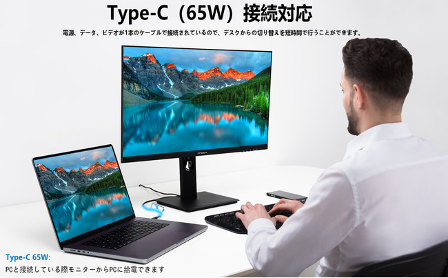 Type-C接続の65W電源供給※により、ノートパソコンの充電と接続を簡単に行うことができます。シングルケーブル ソリューションによりケーブル整理が不要のため、デスク周りがすっきりします。電源供給、ビデオ、オーディオ、データの送信など、すべて1本で解決。