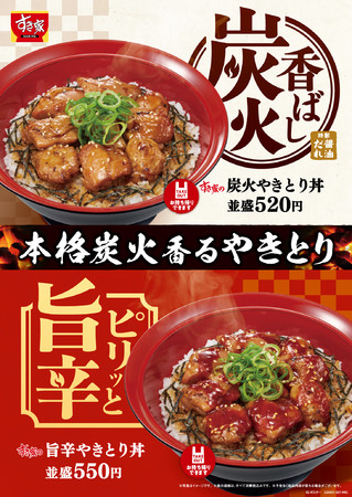 同時に販売する「旨辛やきとり丼」は、「炭火やきとり丼」に唐辛子ベースのピリッと辛いすき家オリジナルの旨辛だれをかけた商品で、香ばしいやきとりの味わいにアクセントを加えます。