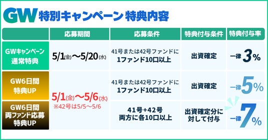 ※両ファンドに各10口以上応募していれば、片方のみ当選・出資確定となった場合でも、出資確定したファンド分には7%を適用いたします。