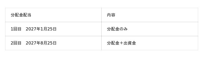・分配金支払日:2027年1月25日(分配金)、2027年8月25日(分配金+出資金)