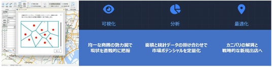 本機能は、地図上の空間分割手法「ボロノイ図」を用いることで、チェーンストア企業の店舗開発担当者が抱える「商圏重複(カニバリゼーション)」や「未開拓エリア(ホワイトスペース)」の発見を強力に支援します。