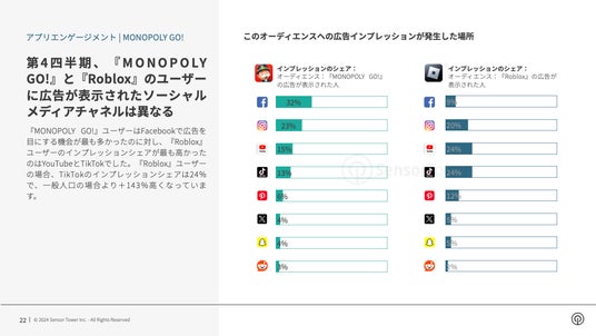 『MONOPOLY GO!』のプレイヤーはFacebookで広告を目にする機会が最も多かったのに対し、『Roblox』プレイヤーのインプレッションシェアが最も高かったのはYouTubeとTikTokでした。