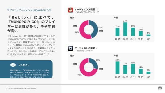 『Roblox』は、第4四半期にアメリカで『MONOPOLY GO!』の次に多くダウンロードされたゲームです。興味深いことに、『Roblox』のユーザー基盤は『MONOPOLY GO!』のオーディエンスよりはるかに女性が多く、年齢層は低くなっています。