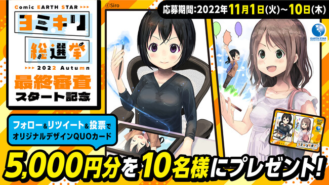 株式会社アース・スター エンターテイメント(東京都・品川区)が運営する無料WEB漫画サイト【コミック アース・スター】では『第1回コミック アース・スターヨミキリ総選挙』最終審査の開始を記念して、2022年11月1日(火)より、5,000円分の特製QUOカードが当たるプレゼントキャンペーン』を開始しました。