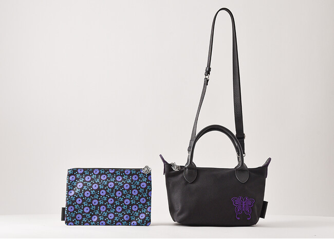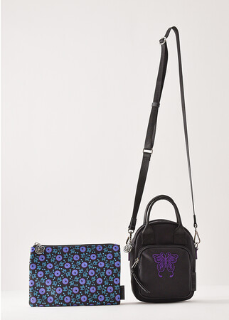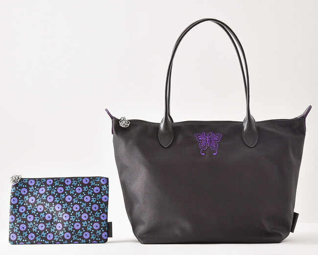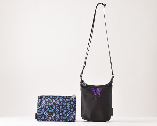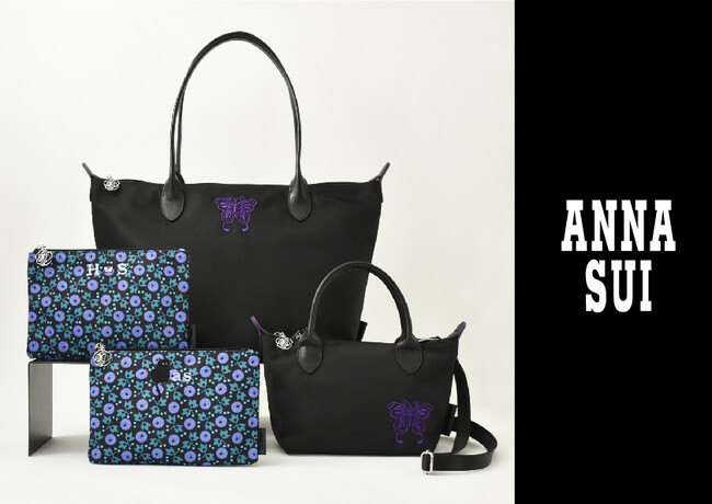 ベーシックなブラックに、ANNA SUIの象徴的なモチーフであるバタフライの刺繍と薔チャームがポイント。