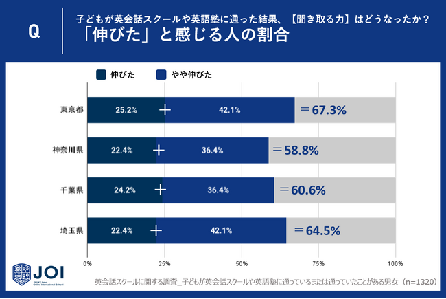 東京都は約7割の親が子供の英語リスニング力の伸びを実感。一番満足度の低い神奈川県でも約6割の親が伸びを実感という好結果