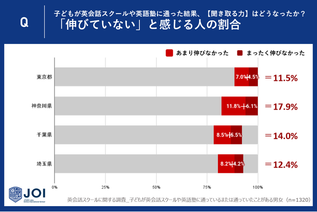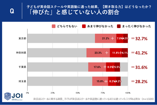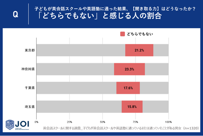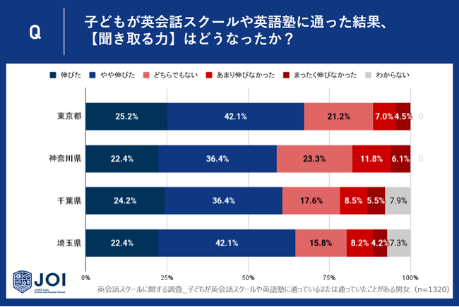 じゅけラボOnlineインターナショナルスクールJOI(所在地:大阪市北区、代表取締役:後藤智則)は、子どもが英会話スクールや英語教室に通っているまたは通っていたことがあると回答した一都三県(東京都330人・神奈川県330人・千葉県330人・埼玉県330人)の親に英会話スクールや英語教室における「英語を聞き取る力(リスニング力)」の成果に関するアンケート調査を実施しました。