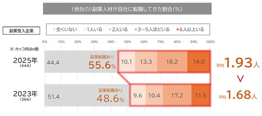 受入企業の55.6%が「(他社の)副業人材が自社に転職してきたことがある」と回答:副業先(副業受入企業)側に、「(他社の)副業人材が自社に転職してきたことがあるか」を問うた。「副業転職あり」の割合は、2023年よりも7.0pt上昇し、55.6%という結果となった。副業転職者の割合が近年増えている可能性が示唆される。