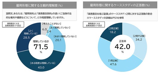 2. 副業実施者の雇用形態に関する理解度:副業実施者に対して、副業の雇用形態に関する理解度を問うたところ、主観的に「理解している」と答える層は7割を超える。しかし、本調査で提示した2問のケーススタディをすべて正解した割合は2割に満たず、正答率は42%と低い結果となった。