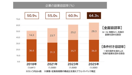 1. 副業容認率が過去最高、全面容認(ルールや制限なく副業を認める)の割合は2018年の約2倍。