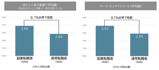 7. 副業転職者の現在のはたらく幸せ実感、ワーク・エンゲイジメントについて確認したところ、いずれも通常転職者と比べて高い傾向。