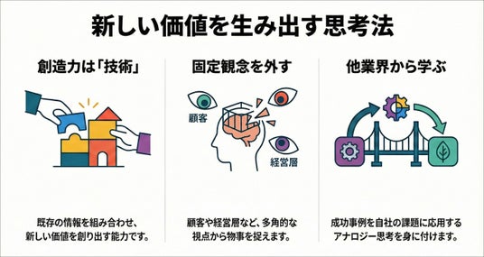 顧客、競合、経営層など、異なる立場からの視点切り替えや、他業界の事例を活用するアナロジー思考を体系的に習得します。