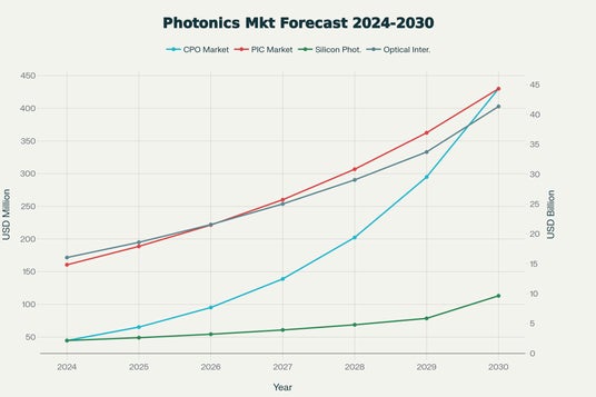 AIデータセンターのエネルギー危機を背景に、銅配線から光インターコネクトへの不可逆的なシフトが進行中。2025-2030年にかけて市場規模は飛躍的に拡大し、シリコンフォトニクスが最大の収益機会として台頭する。