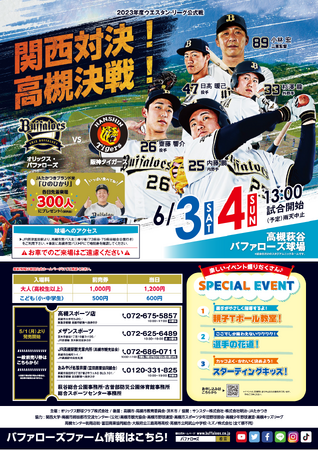 高槻市の萩谷総合公園野球場で6月3日(土曜日)と6月4日(日曜日)プロ野球ウエスタン・リーグ公式戦「オリックス・バファローズ対阪神タイガース」が開催されます。パ・リーグ2連覇を達成し日本一にもなった強豪オリックス・バファローズと関西の人気球団で今シーズン18年ぶりの優勝が期待される阪神タイガースの2軍の選手たちが熱戦を展開!試合終了後にはベースランニング(小学生のみ)、サイン会などお楽しみイベントもあります。ぜひご参加ください。