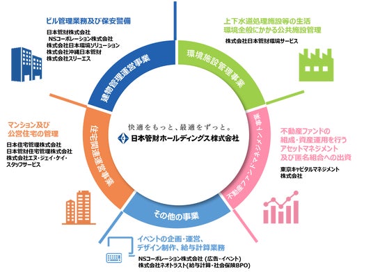 日本管財ホールディングスは、オフィスビルや商業施設等の建物管理運営事業や住宅管理運営事業、環境施設管理事業、不動産ファンドマネジメント事業など、建物管理とその周辺事業を手掛ける企業の持株会社として、2023年4月3日に発足しました。
