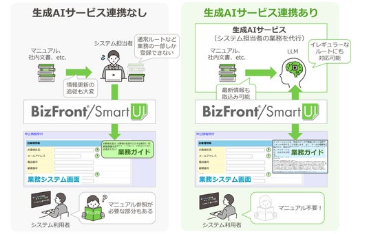 これまでの「BizFront/SmartUI」は、システム担当者が業務システムの画面上に表示する業務ガイドの内容を検討・作成・更新する必要がありましたが、今回企業向け生成AIサービスとの連携オプション機能により、業務マニュアルなどを要約した業務ガイドを自動で表示することができるようになります。これにより、システム担当者が業務システムの理解や業務ガイドの検討・作成などに掛ける手間や時間が削減されます。また、システム利用者は分かりやすく要約された業務ガイドを活用することで、業務をより直感的かつ効率的に進めることが可能になります。