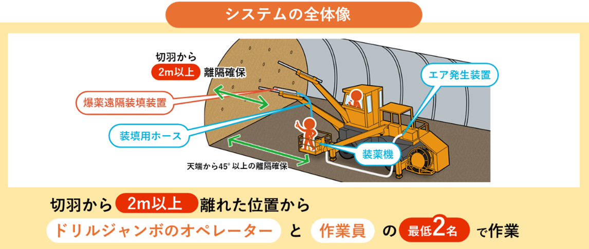 これにより、従来は人力で行っていた装薬孔内の岩片除去作業と爆薬装填作業を、切羽から2m以上離れた位置で、ドリルジャンボのオペレータと作業員の2人で安全に実施できます。