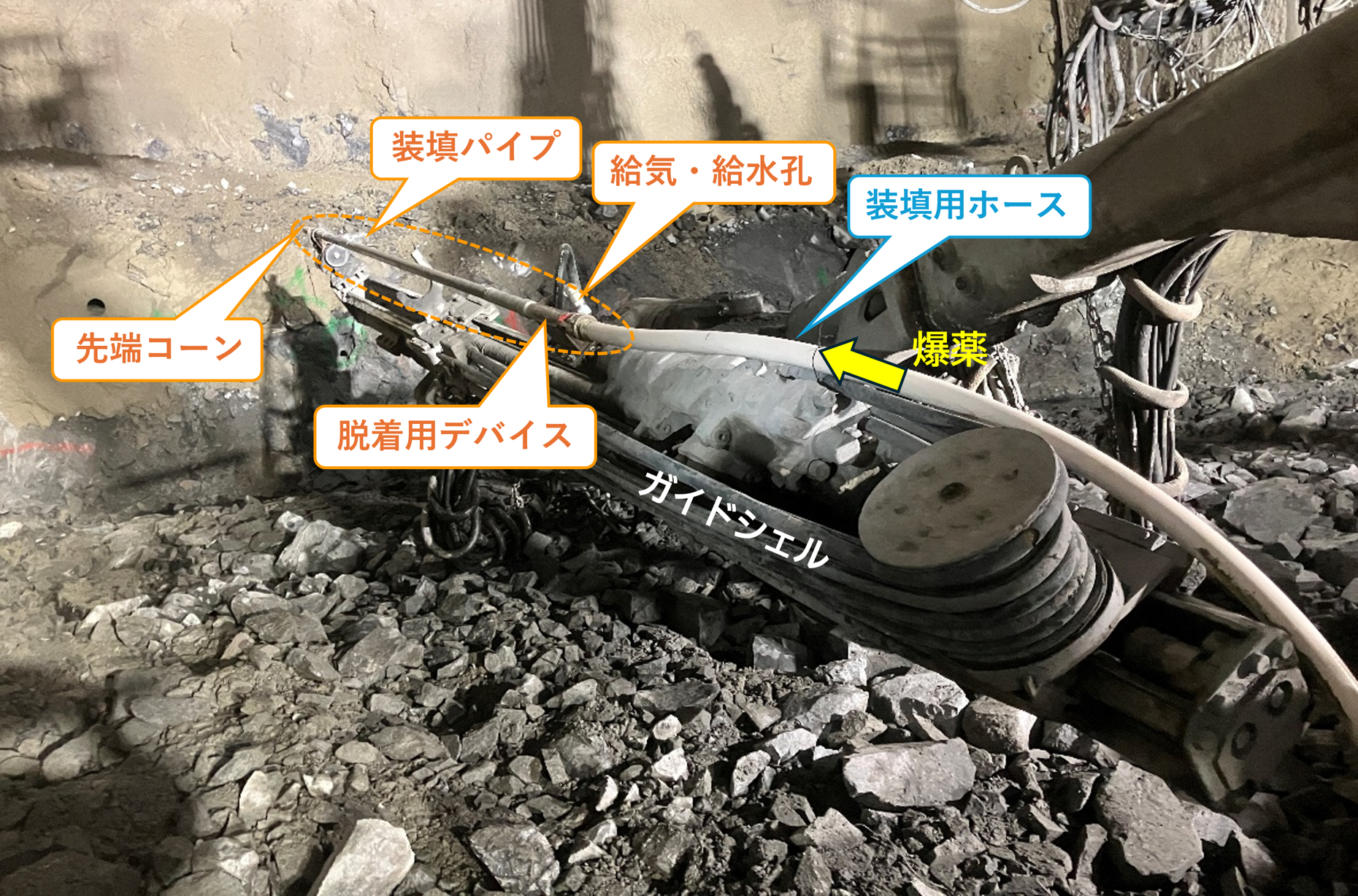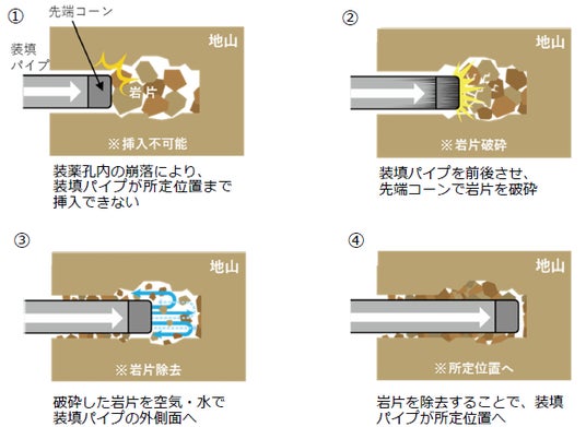 静電気による誘爆リスクを排除するため、「装填パイプ」はカーボンファイバーを主体とする非鉄製に、「先端コーン」はステンレス製にしました。また、装薬孔内に岩片が崩落して装填パイプを所定位置に挿入できない場合は、先端コーンで岩片を破砕し、空気や水で装填パイプ外側面へ押し出して除去します。