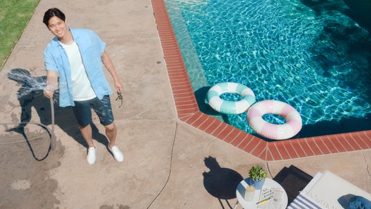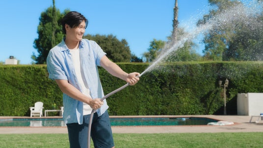 降り注ぐ日差しの下、庭でサングラス姿の大谷選手が豪快に水を撒くシーンからCMは始まります。