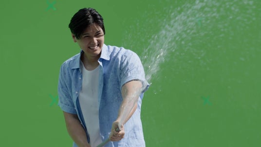 今回のCMの見どころの一つである水撒きのシーンでは、監督から「かなりイタズラっぽい表情で」というリクエストが。ホースを構えた大谷選手は、カメラに向かって茶目っ気たっぷりの表情で水を放ちます。続いて動くスタッフに向けて水を撒くカットでは、勢いよく出る水しぶきを自らも浴びながら、さらにノリノリの様子に。監督やスタッフからも盛り上げの声が飛び交う中、演技ではない“素”の楽しそうな表情が垣間見え、スタジオ全体が明るい空気に包まれました。カットがかかった後、モニターでプレイバックを確認し、その出来栄えに本人も満足げな満面の笑みを見せる一幕も見られました。一転して、髪をかきあげて空を見上げるシーンでは、先ほどとは異なる、まっすぐな眼差しと爽やかな表情が印象的でした。