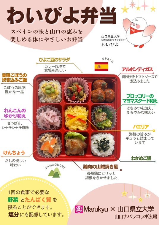 この度、株式会社丸久(本社:防府市/代表取締役社長田中康男)は、山口県立大学栄養学科 課外活動「山口ナバラコラボ広場」と共同で「わいぴよ弁当~スペインの味と山口の恵みを楽しめる体にやさしいお弁当~」を開発いたしました。わいぴよ弁当は第一弾の「スペイン弁当」に続き、今回第2弾の発売となります。