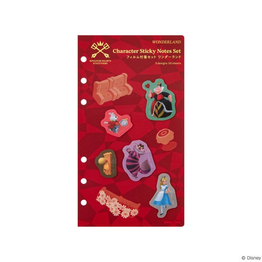 アリスや白うさぎ、ハートの女王など「ワンダーランド」で出会えるキャラクターのフィルム付箋セットです。透け感のある素材でできており、ノートのデコレーションだけでなく、ページの端から飛び出させてインデックスとしてもお使いいただけます。台紙にリング穴があいているため、システム手帳に挟んで持ち歩くこともできます。