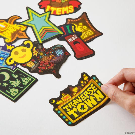 ワールドのロゴやアイコンを始め、ポストやネオンサインなど「トラヴァースタウン」を象徴するモチーフを集めたステッカー10枚セットです。ノートはもちろん、お手持ちの透明なスマートフォンケースにはさんで使用することもできます。