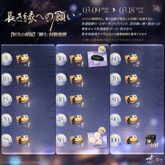 ※願う回数報酬は当期イベント願うにのみ有効となります。詳細はゲーム内のルール説明にてご確認ください。
