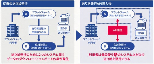 物流現場を取り巻く環境が自動化・高度化する中、EC市場や業務システムを提供するプラットフォーマーの「送り状発行業務の効率化」や「出荷作業の安定運用」へのニーズが高まっています。こうしたニーズにお応えするため、佐川急便では送り状発行APIサービスを展開しています。本サービスはプラットフォーマーが提供する「受注・出荷管理システム」と、当社の「送り状発行システム」をAPI連携させることで、受注データを基に送り状を自動発行できるサービスです。従来、プラットフォーム利用者が行っていた手動でのデータのダウンロード・インポートの作業を削減し、送り状発行から出荷までをスムーズにつなげます。
