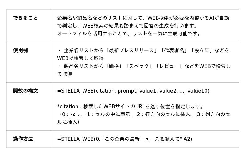 ※2:STELLA_WEB関数、STELLA_RAG関数は、1分間にそれぞれ最大10回までご利用いただけます。月間の最大利用回数は、すべての関数操作を合わせて3,000回となります。