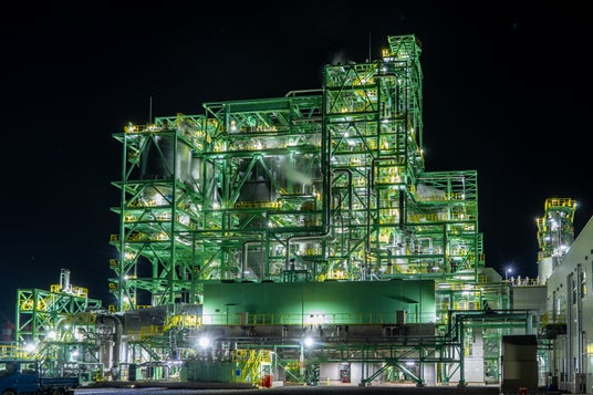 (左:発電所全景、右:夜間にライトアップされた発電所)