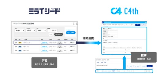 「ミライシード」上で小テストを実施可能にするアプリ「テストパーク」上で受けたテストの結果が「C4th」の成績処理機能に自動API連携されます。