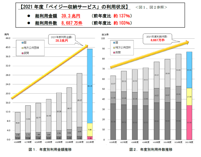 電子決済サービス「Pay-easy(ペイジー)収納サービス※1」における2021年度の取扱金額は39.3兆円、取扱件数は8,687万件を記録し、サービス開始以来20年連続での増加となりました。これは、国や地方において、税や行政手数料のキャッシュレス化や行政手続きのデジタル化が加速したことにより、電子決済であるペイジーの活用機関が増加したこと、コロナ禍で利用者のキャッシュレス決済へのニーズが高まったこと等が大きな要因であったものと考えております。地方団体では、2021年度中に徳島県、春日部市、市原市、八王子市が新たにペイジー収納サービスを開始しています。