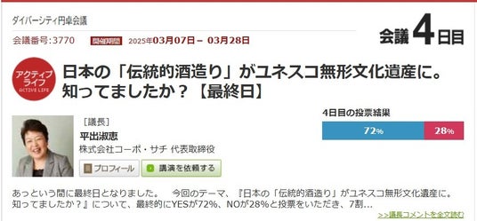 25年前から始まった「ダイバーシティ円卓会議」の3770番目の会議テーマは、「日本の『伝統的酒造り』ユネスコ無形文化遺産に。知ってましたか?」。議長に(株)コーポ・サチ 代表取締役、酒サムライコーディネイターとして活躍する平出淑恵氏を迎え、2025年3月7日(金)から28日(金)まで、4回にわたり議論を行いました。